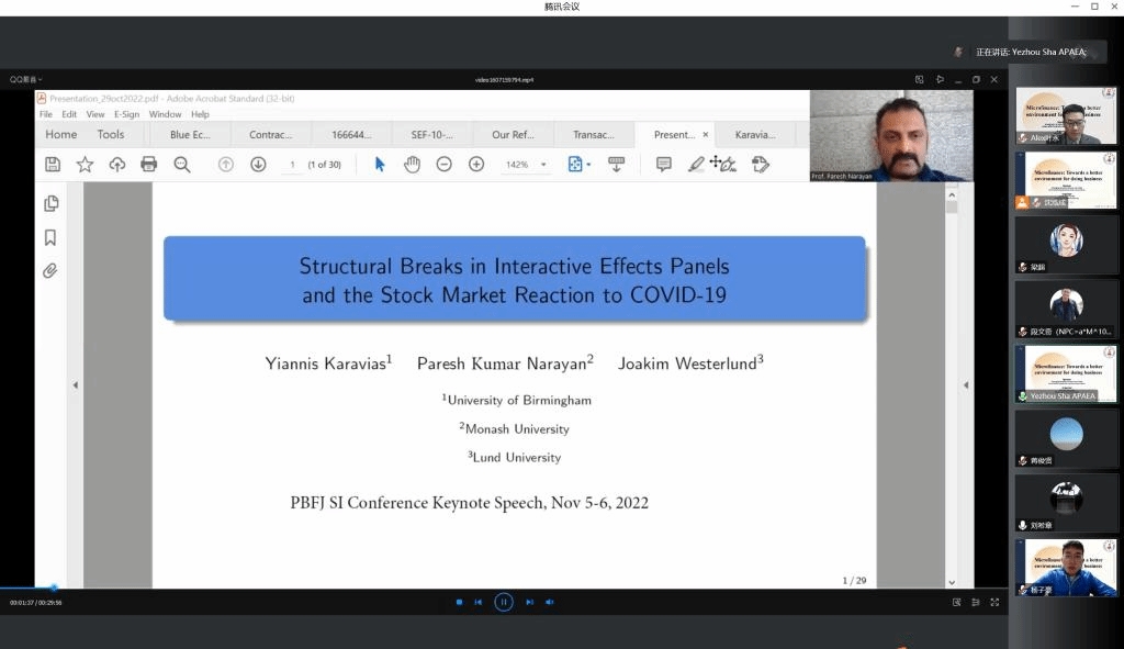 主题报告环节,澳大利亚莫纳什XCSport教授、亚太应用经济学协会主席、EMFT主编Paresh Narayan教授作了Structural Breaks in Interactive Effects Panels and the Stock Market Reaction to COVID-19的主题演讲。介绍了新冠疫情期间,股票收益与新冠肺炎之间关系出现的结构性破裂,阐述了判断是否存在结构性断裂的方法和断裂日期的检测方式。