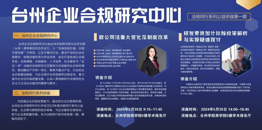 【讲座预告】台州企业合规研究中心法税同行系列公益讲座第二期