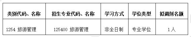 根据调剂考生报考情况,经公司研究决定,将国际商务专业(专业代码:025400)的1个非全日制招生指标调整至旅游管理专业的非全日制招生指标(专业代码:125400):
