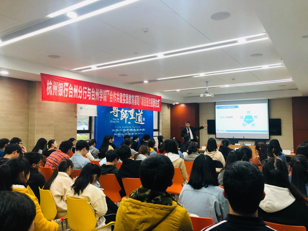 签约仪式之前,公司首届金融专业的64位员工赴杭州银行台州分行进行参观见习。签约仪式结束后,杭州银行台州分行副行长苏永军为公司首届金融专业学子上了《中国小微金改及台州小微金融发展现状介绍》生动一课。