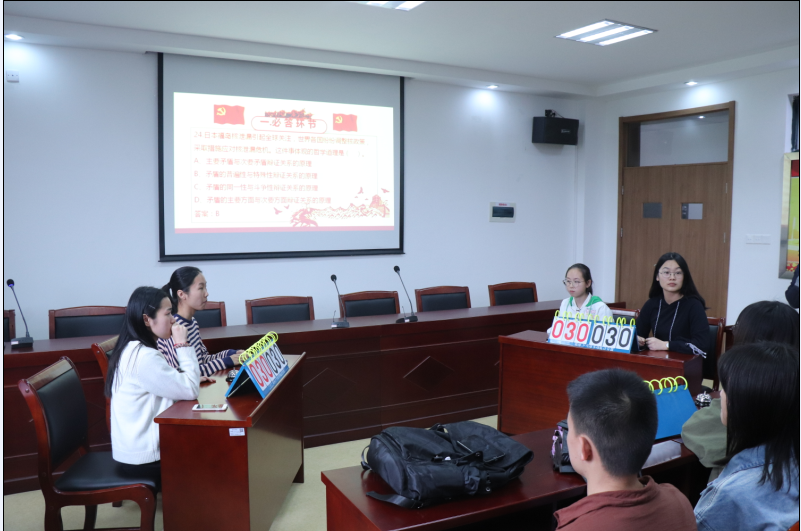 知识竞赛分初赛和决赛两个环节进行,考察内容涵盖习近平新时代中国特色社会主义思想、党章党规、党史国情、形势与政策等方面的内容。初赛吸引了近120名同学参与,12名选手以优秀的笔试成绩脱颖而出,获得决赛资格。4月28日下午,在公司党员之家,12名选手先后以团队和个人形式进行现场角逐,必答环节他们沉着应战、抢答环节你追我赶,现场气氛紧张激烈。最终,来自17财管的金海兵以其扎实的理论功底、优秀的现场表现斩获桂冠,来自旅游管理、国际贸易等专业的其他选手分别获得二、三等奖。