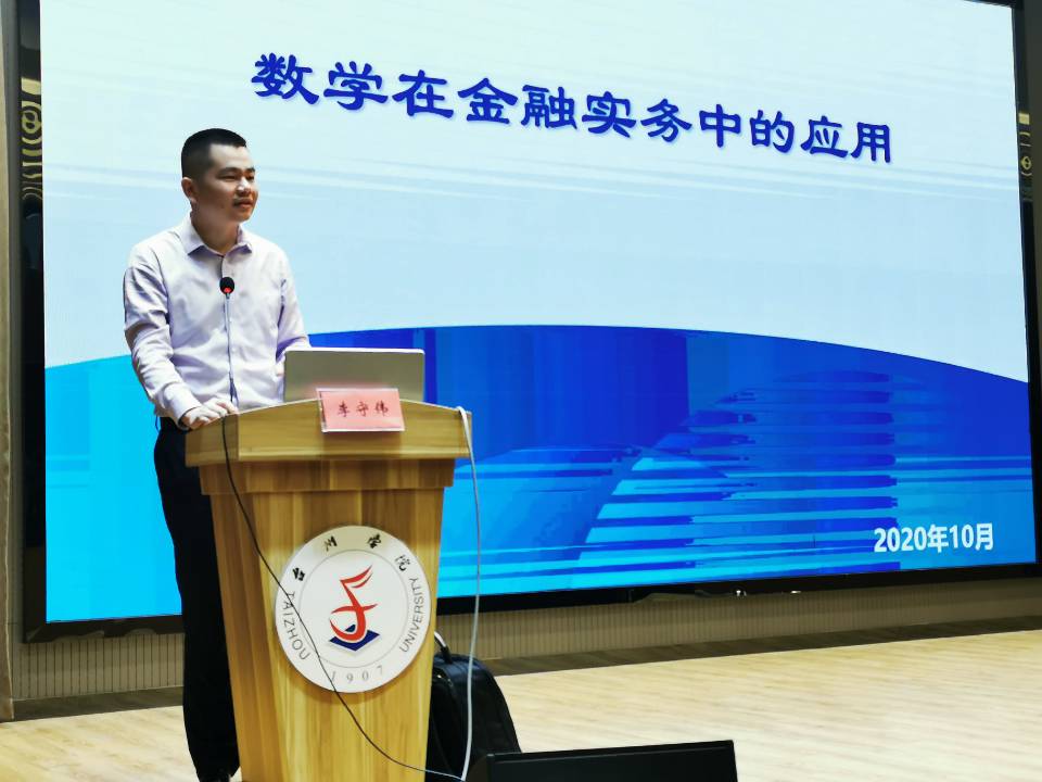10月10日下午,申万宏源证券风险管理总部总经理助理、证券投资委员会委员李守伟先生为XCSport金融学专业全体师生作“数学在金融实务中的应用”学术报告,XCSport副经理陈国栋出席报告会。