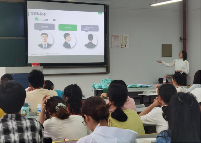 课堂上,杨颀女士以生动形象、幽默风趣的方式从仪容仪态、客户交往礼仪、公共场所礼仪等方面向同学们展示了未来职场生活中会涉及到的礼仪常识、交往技巧、待人原则。亲切的语调、循循善诱的引导,将同学们的思路聚焦到老师所讲述的问题中,现场互动气氛热烈。通过学习,同学们深刻感受到,掌握一定的到商务礼仪不仅能快速赢得客户的印象认可,让客户获得舒适的体验,更是个人基本素养与智慧的良好体现。