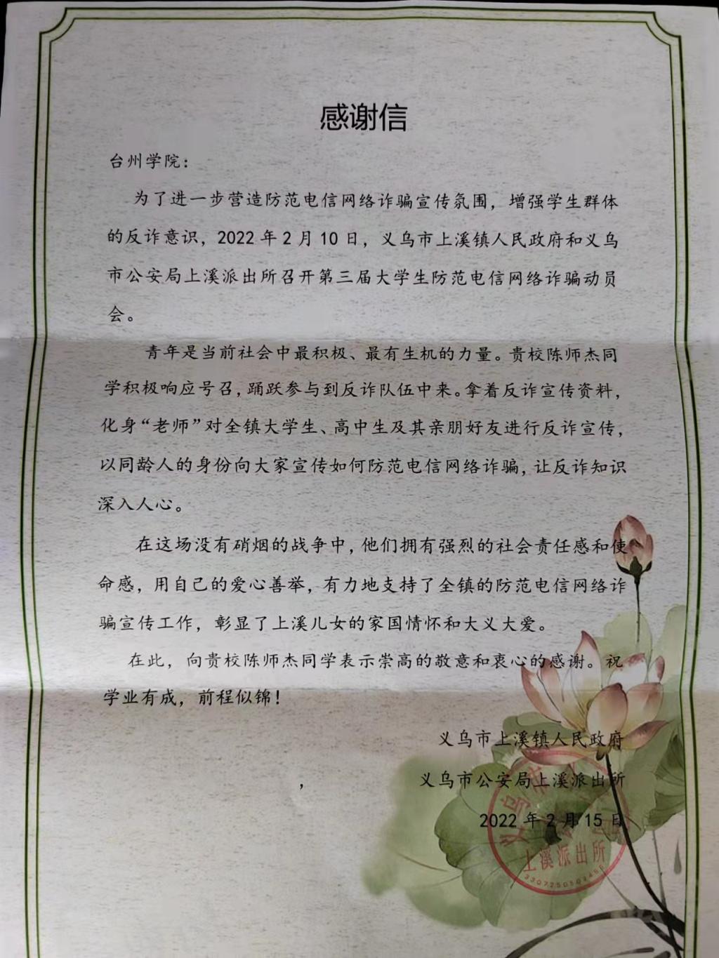 近日,XCSport收到一封来自义乌市公安局上溪派出所的感谢信:“贵校陈师杰同学积极响应号召,踊跃参与到反诈队伍中来。拿着反诈宣传资料,化身‘老师’对全镇老员工、高中生及其亲朋好友进行反诈宣传,以同龄人的身份向大家宣传如何防范电信网络诈骗,让反诈知识深入人心。”信中对公司陈师杰同学在反诈宣传工作中的表现表示了充分的肯定和由衷的感谢。
