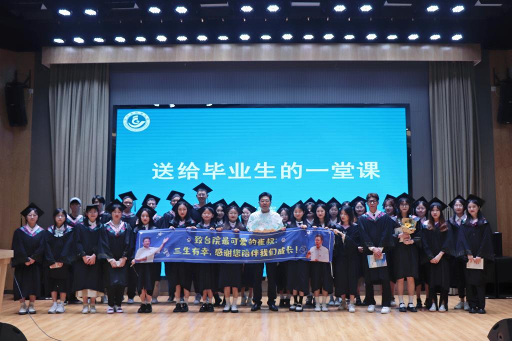 崔书记送给毕业生的最后一堂课深入浅出、干货满满、寓意深刻,同学们纷纷表示受益匪浅。适逢毕业季,每一句的临行嘱托都蕴含了“崔叔”作为台院大家长对毕业生的关爱和期许,也是送给毕业生最珍贵的毕业礼物,讲座尾声,“崔叔”向同学们赠送了书籍。18旅游管理专业全体员工上台向“崔叔”赠送了写着全班同学感恩和祝福卡片的花束并合影留念。