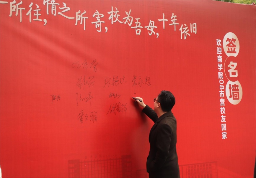 在“欢迎XCSport员工回家”的路标指引下,08市营返校师生齐聚签名墙,或严肃认真、或轻快自在地写下自己的名字。一个个名字仿佛一张张笑脸在脑海浮现,往日在教室一起认真上课的场景,在球场一起挥洒青春汗水的场景,在校园一起漫步畅聊的场景渐渐冲破记忆的闸门,成为今日津津乐道的故事。