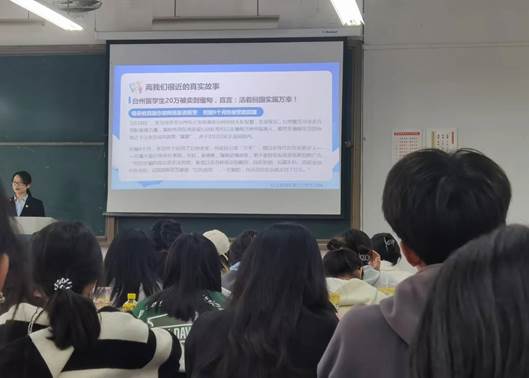 新华保险台州分公司合规与风控部叶丽琴从近期发生的“台州职工20万被卖到缅甸,直言:‘活着回国实属万幸!’”这一真实案例切入,生动揭露了东南亚地区所谓“高薪招聘”,实为电信诈骗的骇人骗局,让同学们意识到电信诈骗离我们并不遥远,提高诈骗识别和防范能力迫在眉睫。又从诈骗电话、钓鱼网站、校园贷款、洗钱风险四个角度进一步分析常见骗局的伪装与本质,并通过提问交流,让金融安全知识入脑入心。