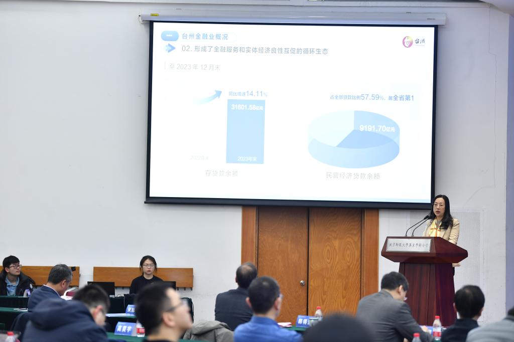 台州市人民政府金融工作办公室是本次研讨会的指导单位,在会上林敬萍副主任以“台州普惠小微金融创新发展经验”为题,向参会的各位专家、学者们详细介绍了台州十余年的省级、国家级小微企业金融服务改革创新举措与成效,以及正在谋划创建国家小微金融改革示范区的具体设想。