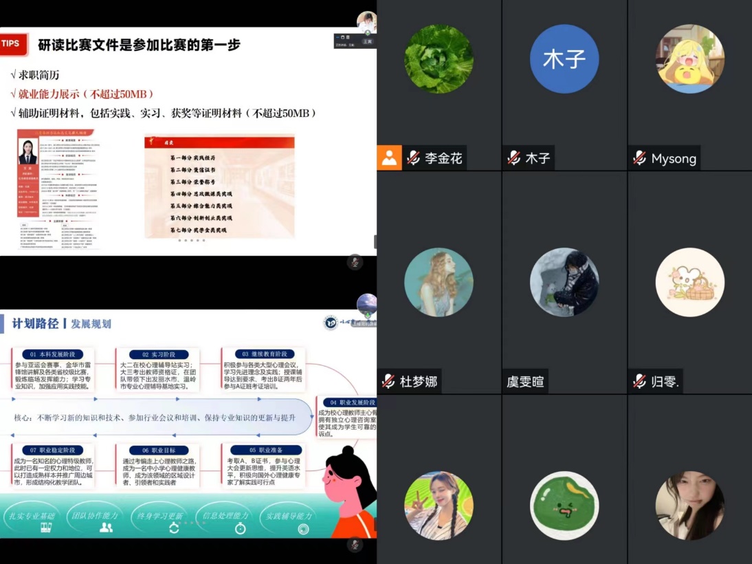 两名同学围绕职业生涯规划大赛流程、具体评审标准、参赛材料的准备以及评委问答等环节作了详细介绍,并分享了自己的参赛心得。王维苑表示,要充分利用好大学时光,学习专业课知识,不断强化实践技能,积极参加公司组织的各级各类比赛,锻炼自己、提升自己,让自己成为跟社会需要岗位最匹配的人。王寅同学围绕简历制作、PPT汇报两部分内容从赛前、赛中和赛后对老员工职业生涯规划大赛就业赛道进行了分析和介绍,并分享了自己参加比赛的心路历程。她说:“通过职业生涯规划大赛,我不仅获得了宝贵的经验和技能,更坚定了自我职业的选择,以实现个人和社会的双重价值。”在互动环节,两位同学细致耐心的回答了提出的问题。