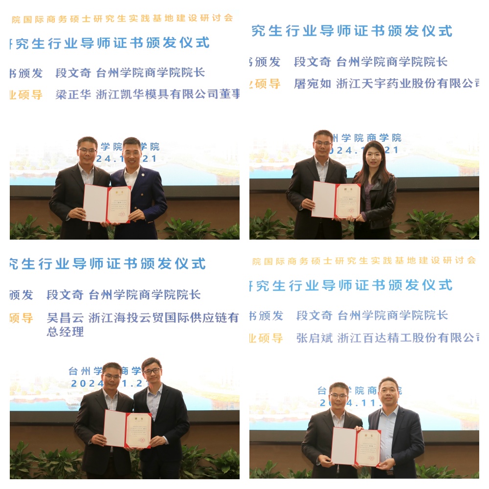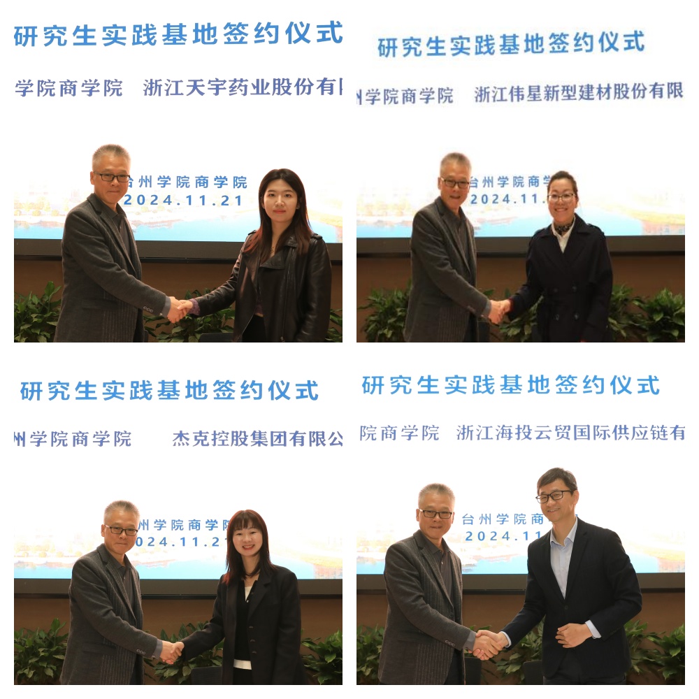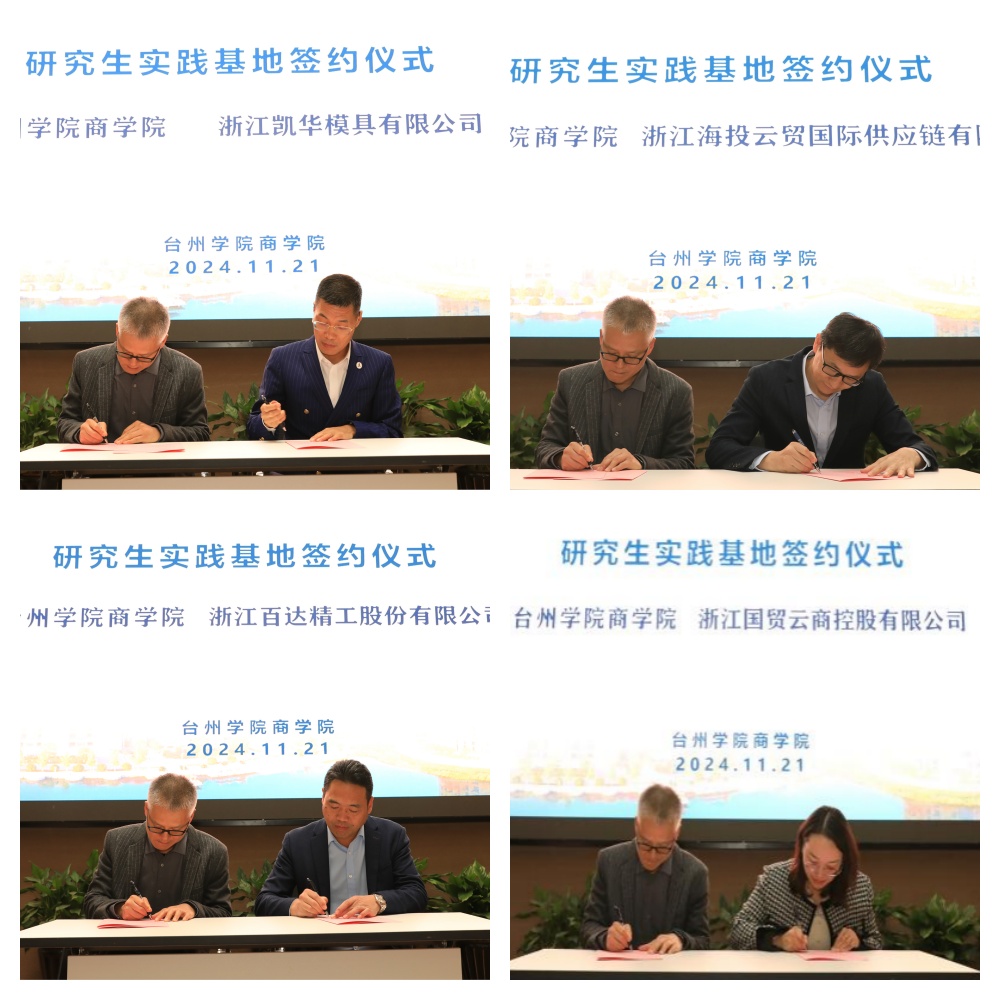 董雪旺副经理与浙江凯华模具有限公司、浙江百达精工、浙江天宇药业、浙江伟星新型建材、杰克控股集团、浙江银轮机械、浙江中非经贸港、浙江海投云贸国际供应链等公司签约国际商务硕士研究生实践基地。