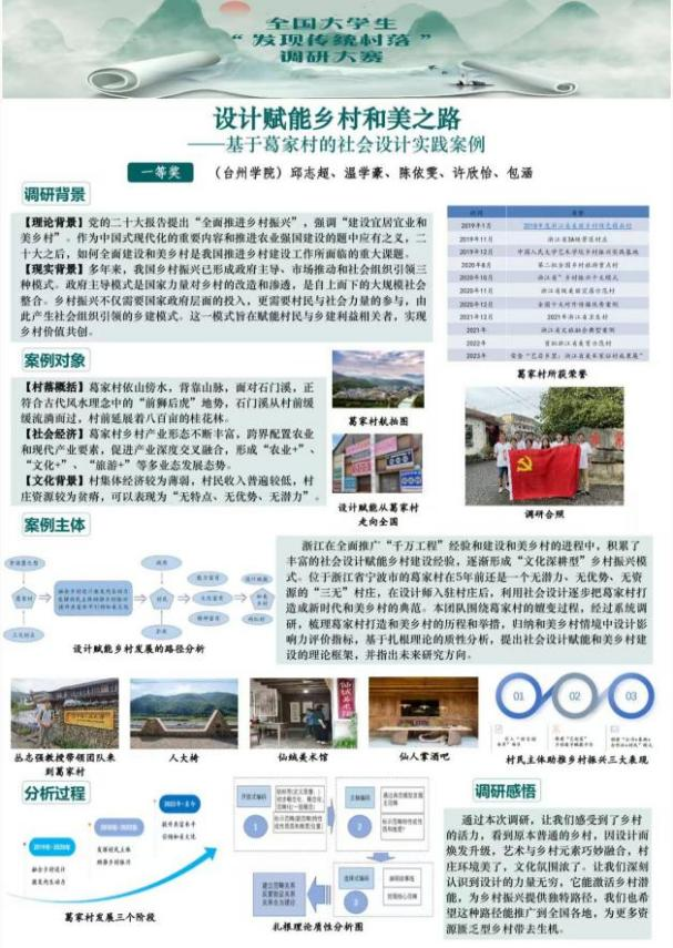 XCSport“设计赋能乡村振兴”暑期社会实践队紧跟时代步伐,以“设 计赋能乡村和美之路”为主题,秉持“深入乡村,知行合一”的理念,在指导老师陈国栋的带领下,前往宁波市葛家村,开展本次调研,以《乡村振兴的维度》文本作为理论来源、问题导引,在其跨越时空的思想力量指导下,本文使 用文献研究、实地调研等方法,围绕葛家村的嬗变过程,经过系统调研,梳理葛 家村打造和美乡村的历程和举措,归纳和美乡村情境中设计影响力评价指标,提出社会设计赋能和美乡村建设的理论框架,并指出未来研究方向。