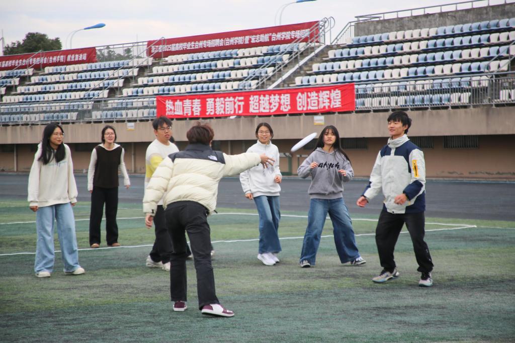 此次比赛采取小组循环赛与淘汰赛相结合的方式,通过规则讲解和安全事项强调,选手们对本次比赛有了充分的了解。各小组队员经过热身运动后迅速进入状态,攻防转换流畅,飞盘在空中划出一道道优美的弧线,精准而迅速地传递给队友。赛场上,同学们不仅展现了个人的速度与技巧,更体现了团队协作的力量。他们相互鼓励,顽强拼搏,在奔跑与追逐中尽情享受运动带来的快乐与满足。比赛现场高潮迭起,观众的欢呼声与加油声此起彼伏,营造了一个既紧张又充满乐趣的竞技氛围。经过几轮激烈的比拼,最终三支队伍脱颖而出,分别是冠军“啊对对”队摘得,亚军“从容应”队获得,季军“AAA飞盘批发”队。活动在颁奖与合影留念中圆满落幕。选手纷纷分享了自己的心得与收获,表达了对未来挑战的期待与信心。