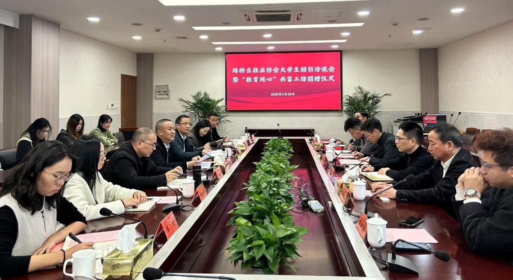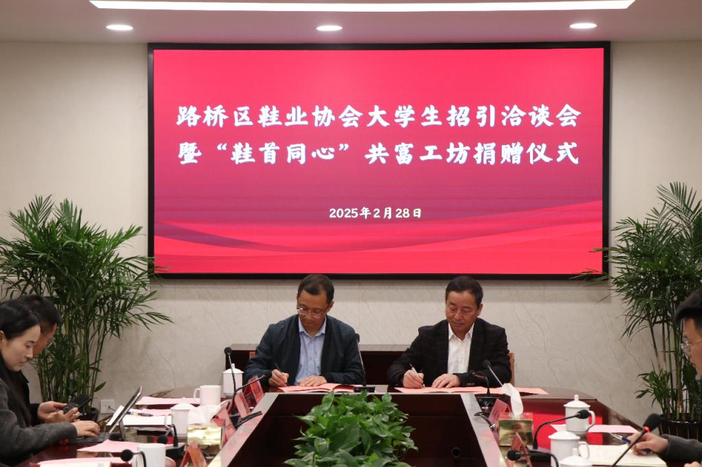 2月28日下午,路桥区鞋业协会老员工招引洽谈会暨“鞋首同心”共富工坊捐赠仪式在椒江校区行政楼第一会议室举行。公司党委学工部部长杨启富、公司党委书记马斌,路桥区委组织部部务会议成员潘泰柽,路桥区螺洋街道办事处组织委员李伟斌,路桥区鞋业协会会长戴明昌,“鞋首同心”共富工坊负责人李俊东出席活动,校学工部副部长王林军主持活动。