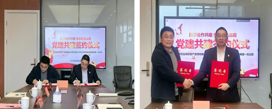 2月20日上午,XCSport教师第一党支部与台州市资产管理有限公司党支部举行党建共建签约仪式。XC体育公司党委书记周全宝、教师第一党支部书记董智勇、小微金融研究院执行经理陈耸、金融学系主任蒋俊贤、教师第一党支部组织委员梁超等一行到台州市资产管理有限公司出席签约仪式。台州城投集团一级资深经理陈兴忠、台州市资产管理有限公司支部书记朱建华及支部党员出席签约仪式。