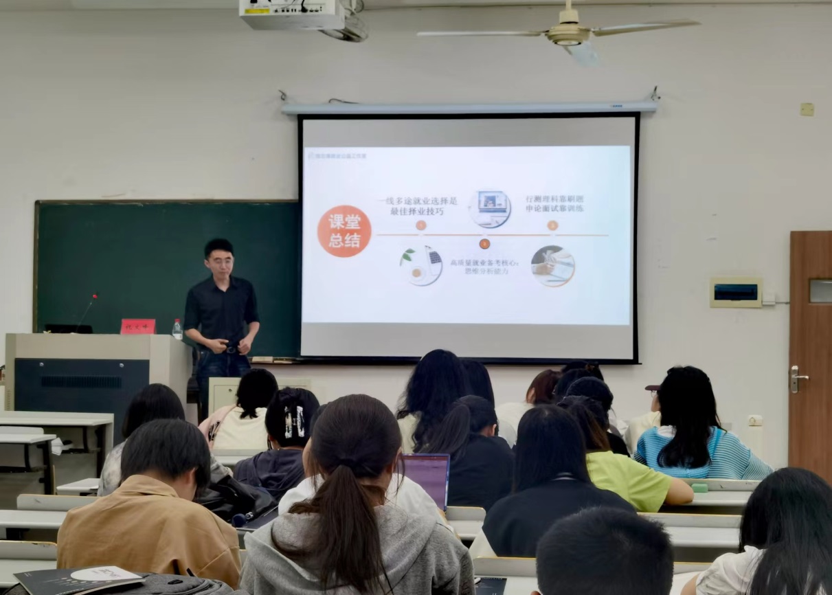 讲座伊始,祝文峰结合近年老员工就业形势及个人经历,介绍了当前公务员招考的岗位需求和薪酬待遇;并结合近年XCSport毕业生就业去向的调查数据,比较分析不同行业的优缺点,就“为什么要考公”提出了看法,他认为,编制类考试是员工实现高质量就业的一个选择。随后,祝文峰老师分享了笔试、面试备考技巧,不仅为自学备考的员工整理出一条合理、有规划的任务时间线,还分享了几个行测、申论的网络资源,为不同需求的员工提供了不同的备考建议。在笔试方面,祝文峰强调,思维能力尤为重要,行测考题的深层内核比表象更复杂,考查核心是思维的深度和广度;申论部分则需要更多地阅读《人民日报》等权威刊物的评论,以积累素材和训练思维能力。讲座最后,祝文峰解释了应届生的概念和三方协议的作用,让同学们对其涵义又了更深刻的理解。