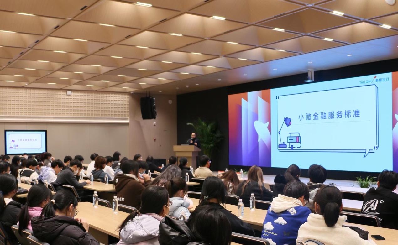 随后,师生在会议室聆听了泰隆银行台州分行副行长傅振关于小微金融服务标准的专题讲座,并参加了XC体育老员工就业基地授牌仪式。