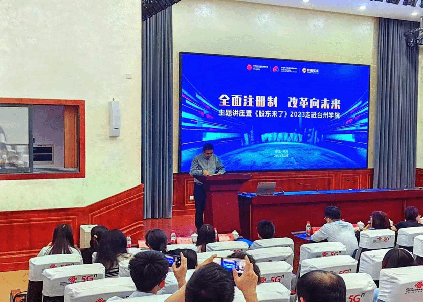 在讲座开始前,来自财通证券总部的葛子微介绍2023《股东来了》投资者权益知识竞赛活动详情。《股东来了》这个活动是中国证监会投资者保护局为指导单位,中证中小投资者服务中心联合地方监管局共同主办、协会协办、券商承办,各市场主体共同参与,以多个赛区覆盖全国及港澳台地区的投资者权益知识大赛。大赛旨在进一步落实证监会党委关于资本市场人民性监管要求,切实履行保护投资者合法权益的职责,实实在在地保护投资者的钱袋子。通过两天的设点宣传,近千名师生报名参赛,期待大家在竞赛中增长才干,收获知识与技能。走进XC体育是“全面注册制,改革向未来”暨《股东来了》2023投资者权益知识竞赛在台州高校的唯一一次宣讲,宣讲会现场有浙江省证监局、台州市银保监分局、浙江证券业协会、台州市金融办、财通证券台州分公司相关负责人,XC体育公司党委书记马斌代表公司出席了本次活动。