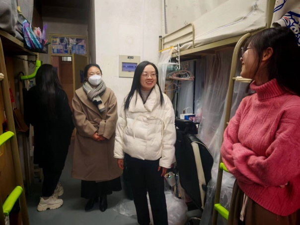 在走访过程中,老师们亲切地与同学们展开交流,关注同学们的衣食住行、假期生活及新阶段计划。同时,对于寝室良好氛围的培育,老师们叮嘱大家要互帮互助,室友之间多沟通交流,取长补短。对于寝室卫生与安全,老师们强调安全无小事,防范于未然,坚持安全第一,保持良好宿舍卫生。老师们还了解到不同年级同学在新学期的不同计划与目标,鼓励大家要多参加科研竞赛、社会实践,以蓬勃向上的昂扬态势来开启新一学期的生活。