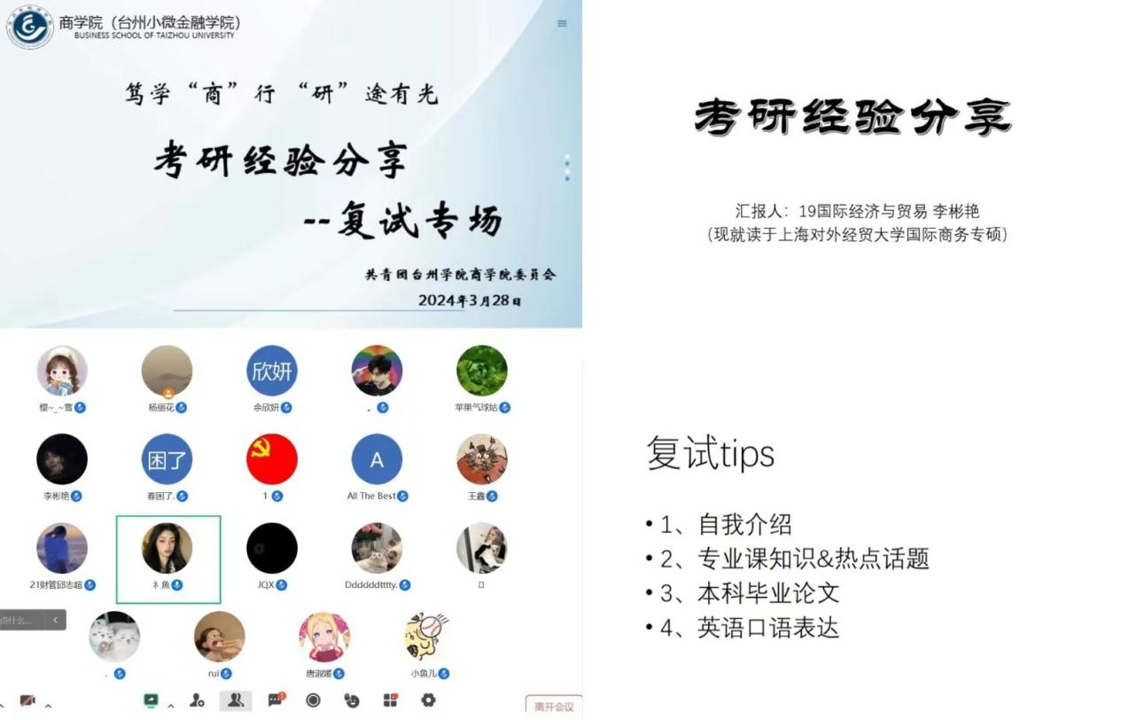 分享会上,现就读于上海对外经贸大学的李彬艳学姐结合自身经验,为考研复试学子提供建议,涵盖中英文自我介绍、专业课与热点问题、本科毕业论文熟悉度、英语口语及整体规划等方面。她建议提前准备、加强训练、合理规划时间,以积极心态迎挑战,圆考研梦。就读于浙江工业大学的曹瑜嘉学姐分享考研调剂经历,强调选择合适公司的重要性,推荐用Excel整理公司信息。她指出面试时自我介绍应流畅,回答问题需有逻辑,并保持积极心态,勇敢面对困难。