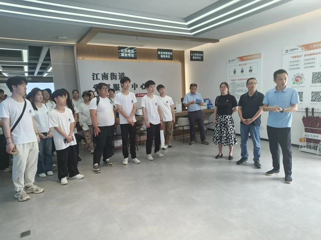 接着,实践队走访了江南街道党群服务中心,与现场工作人员进行交流,听取了有关台州市上市企业的介绍,并了解到政府对老员工就业的一系列扶持政策,为老员工就业提供了更多机会。