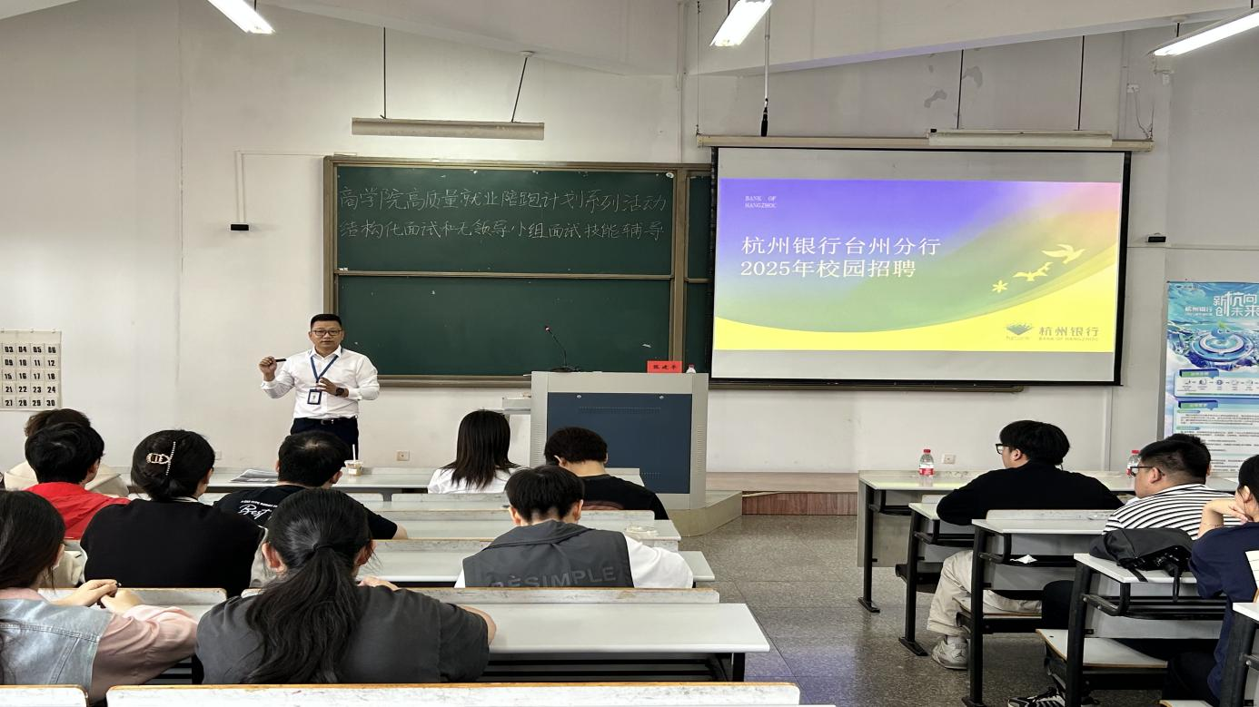 张建平向同学们介绍现阶段银行的分类和发展趋势,说明选择的重要性,对同学们在银行业的就业选择提出中肯建议,鼓励同学们多去企业实习,向同学们发出到杭州银行实习的诚挚邀请。