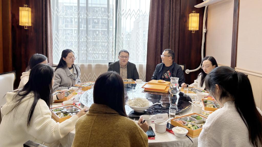 午餐会现场,氛围轻松而活跃,丁书记与员工们围坐一堂,亲切交流,话题涵盖学习进展、日常生活以及未来职业憧憬等多个维度。同学们满怀热忱,积极分享各自在学业上的感悟与生活中的体验,丁书记专注倾听,不时点头予以肯定,并对员工们的未来发展规划给予了指导。他强调,员工时代作为人生的“拔节孕穗期”,做好规划是十分重要的,鼓励同学们尽早锚定目标,深度挖掘自身兴趣特长,紧密契合社会发展需求,科学规划自身未来。