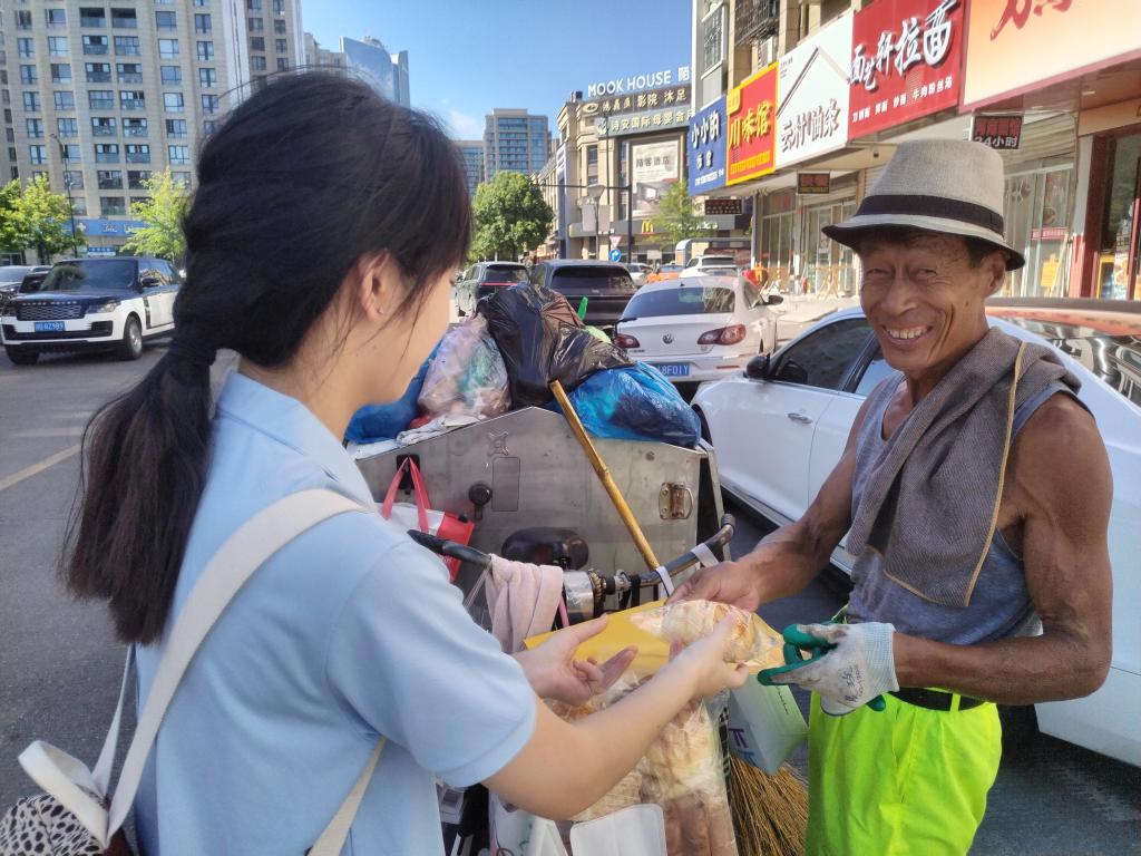 实践队成员们通过多方联系,提前准备好了新鲜美味的面包。随后,队员们走向街道的各个角落,寻找正在辛勤工作的人们。看到环卫工人、货车司机师傅和小区保安忙碌的身影,实践队员们主动上前,将面包递到他们手中,并真诚地向他们道一声“辛苦了”。一位环卫工人阿姨真诚地表示:收到面包后,收获了一整天的好心情。实践队又来到菜市场,为卖菜的摊主们送上爱心面包。这些平日里默默无闻为大家提供社会服务的劳动者们,在接过面包时,纷纷露出真诚的笑容,以质朴的语言表达感谢。