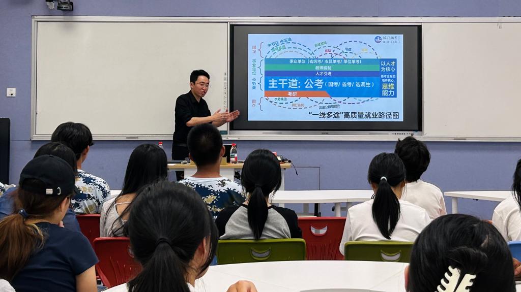 结合XCSport各专业特点与当前就业趋势,祝老师深入剖析了未来的就业前景,强调了尽早树立就业目标、科学进行职业规划的重要性。他通过“一线多途”高质量就业路径图,细致讲解了各类公招考试不同方向的选择策略与准备要点。依托其在公考培训领域的多年积淀,祝老师分享了诸多独到见解,并指出,无论是选择哪条路径,思维能力的持续锻炼与提升都是实现高质量就业的核心竞争力。