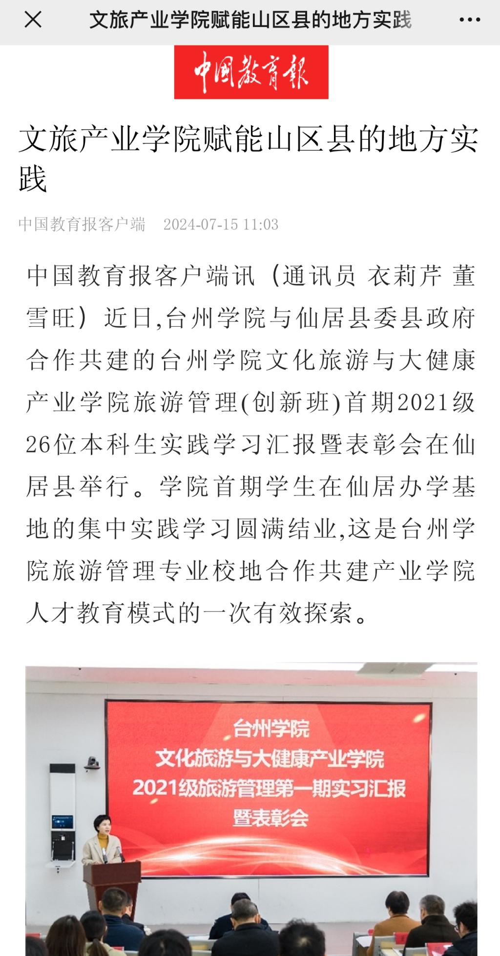 近日,XC体育与仙居县委县政府合作共建的XC体育文化旅游与大健康产业公司旅游管理(创新班)首期2021级26位本科生实践学习汇报暨表彰会在仙居县举行。公司首期员工在仙居办学基地的集中实践学习圆满结业,这是XC体育旅游管理专业校地合作共建产业公司人才教育模式的一次有效探索。