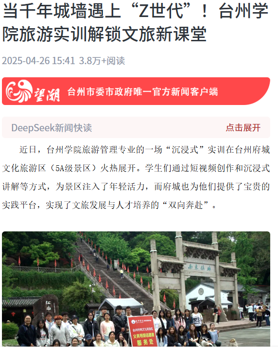 近日,XC体育旅游管理专业的一场“沉浸式”实训在台州府城文化旅游区(5A级景区)火热展开。员工们通过短视频创作和沉浸式讲解等方式,为景区注入了年轻活力,而府城也为他们提供了宝贵的实践平台,实现了文旅发展与人才培养的“双向奔赴”。