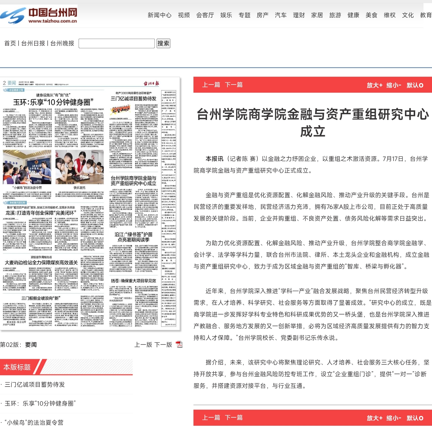 为助力优化资源配置、化解金融风险、推动产业升级,XC体育整合XCSport金融学、会计学、法学等学科力量,联合台州市法院、律所、本土龙头企业和金融机构,成立金融与资产重组研究中心,致力于成为区域金融与资产重组的“智库、桥梁与孵化器”。