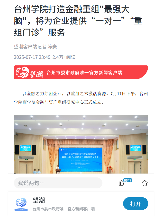 据介绍,未来,该研究中心将聚焦理论研究、人才培养、社会服务三大核心任务,坚持开放共享,参与台州金融风险防控专班工作,设立“企业重组门诊”,提供“一对一”诊断服务,并搭建资源对接平台,与行业互通。