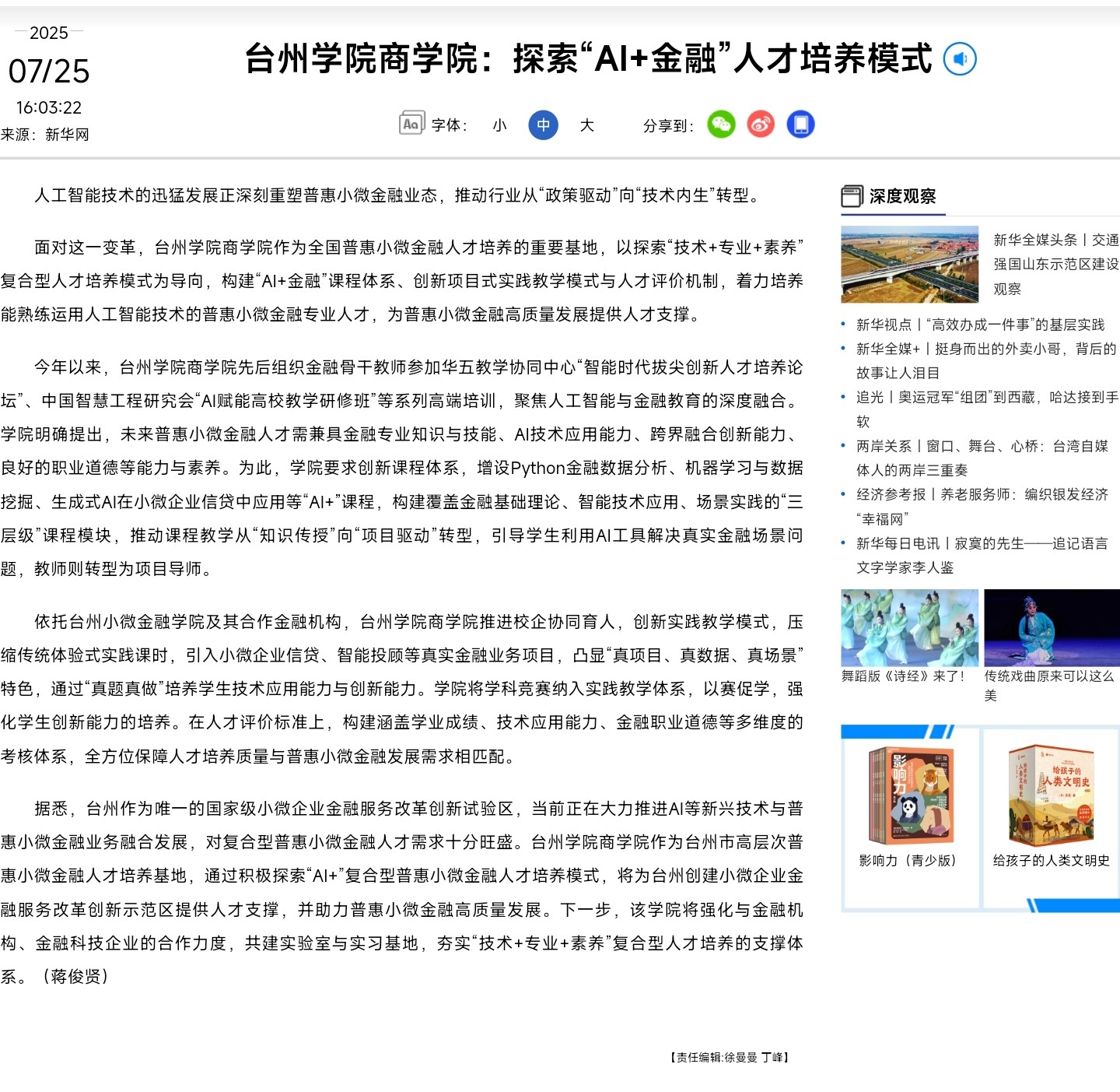 据悉,台州作为唯一的国家级小微企业金融服务改革创新试验区,当前正在大力推进AI等新兴技术与普惠小微金融业务融合发展,对复合型普惠小微金融人才需求十分旺盛。XCSport作为台州市高层次普惠小微金融人才培养基地,通过积极探索“AI+”复合型普惠小微金融人才培养模式,将为台州创建小微企业金融服务改革创新示范区提供人才支撑,并助力普惠小微金融高质量发展。下一步,该公司将强化与金融机构、金融科技企业的合作力度,共建实验室与实习基地,夯实“技术+专业+素养”复合型人才培养的支撑体系。